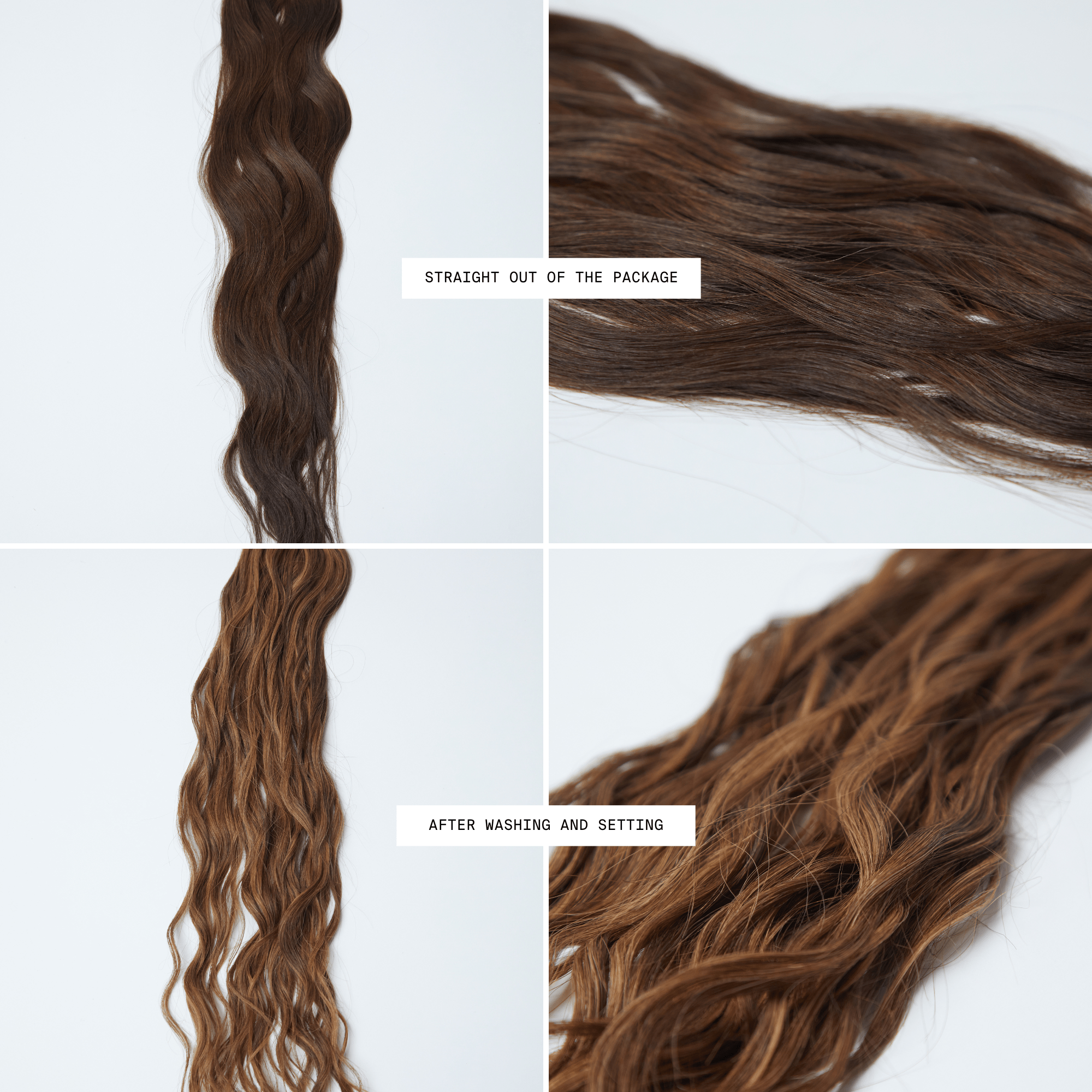Curly and natural wave extensions look their best with minimal heat styling. Air-drying or diffusing is best. If using a diffuser, low heat and low speed are your best friends.